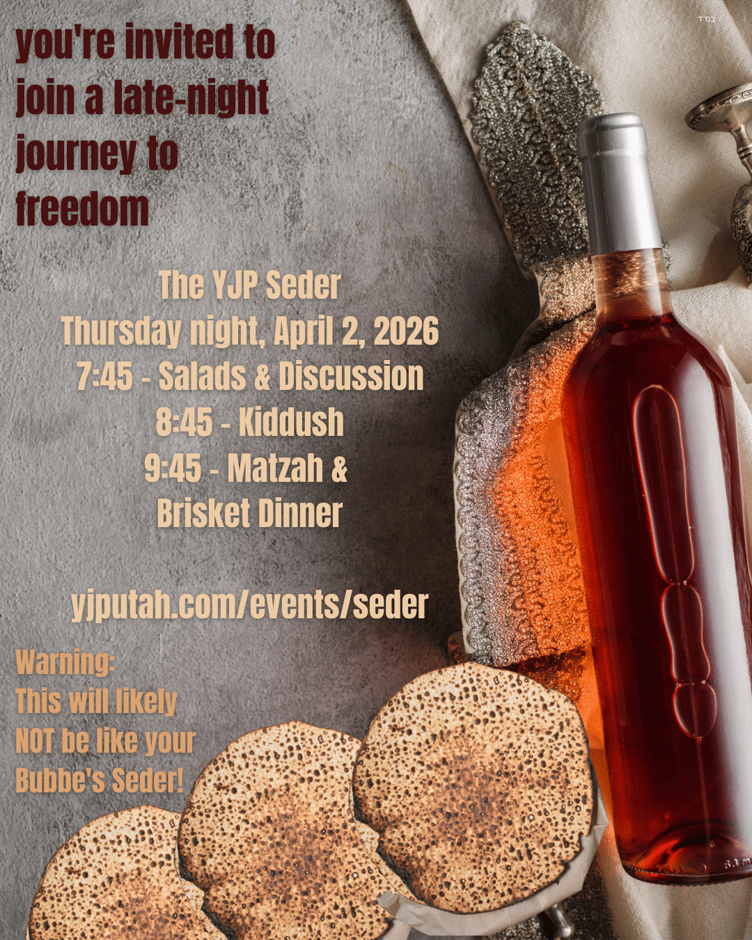 Celebrate your freedom and liberation with the YJP Seder! Explore the mystical secrets of the Haggadah like never before, enjoy a brisket dinner fit for a king, and say L’chaim on four glasses of wine together with friends and family!